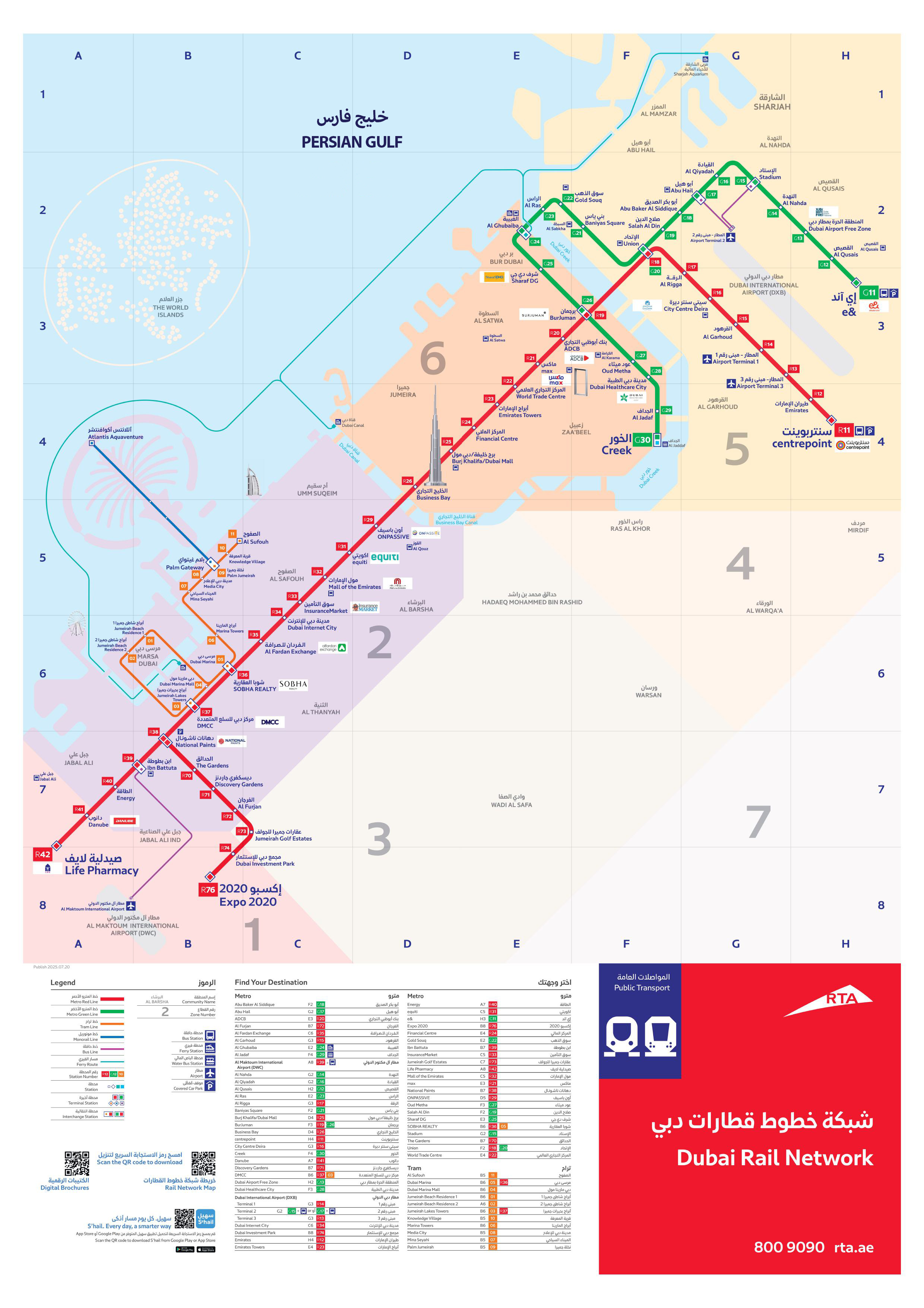 درحالحاضر، دبی فقط دو خط مترو دارد که این خطوط با رنگهای سبز و قرمز مشخص شدهاند. با توجه به اطلاعات موجود، خط دیگری هم در دست احداث دارند که تا آمادهشدنش، زمان میبرد. خطوط سبز همانطور که در نقشه مترو دبی مشاهده میکنید، تعداد 20 ایستگاه (از منطقه اتصالات تا کریک) و خطوط قرمز تعداد 35 ایستگاه (از الرشیدیه تا لایف فارمسی و اکسپو 2020) دارند که دو ایستگاه میدان اتحاد دبی و خالد بن ولید در این دو خط مشترک هستند.
